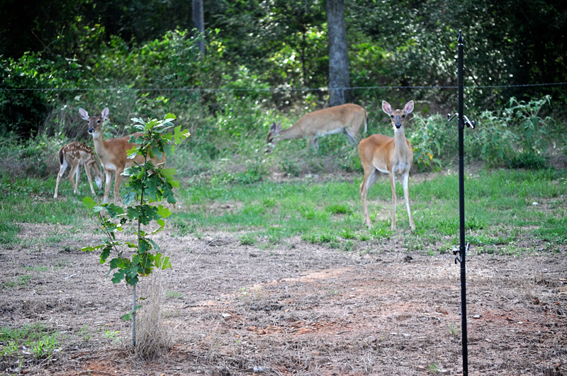 That vertical post is the bird feeder which is about halfway from the house and the hot wire you see in front of the deer.